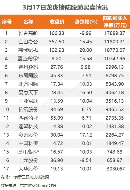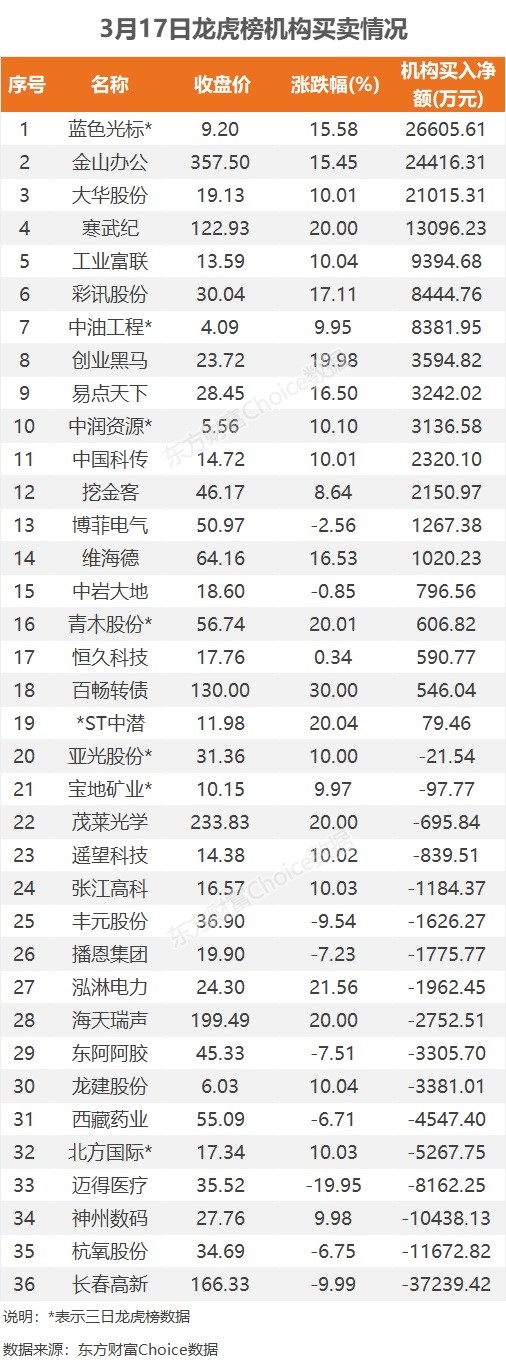 3月17日龙虎榜:4.35亿抢筹金山办公 机构净买18只股