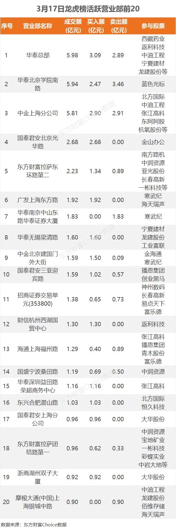从营业部角度来看,华泰总部日内成交5.98亿元,参与了西藏药业、返利科技、中油工程、宁夏建材、龙建股份等股票。中金上海分公司日内成交5.81亿元,参与了北方国际、中油工程、张江高科、东阿阿胶、杭氧股份等。华泰无锡梁清路日内成交1.6亿元,参与了宁夏建材、龙建股份和工业富联。