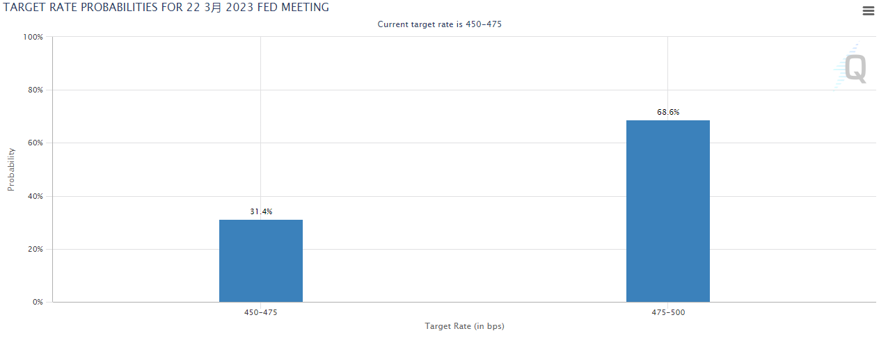 一周之前,市场曾一度认为美联储很可能会在下周议息会议上加息50个基点,但在硅谷银行倒闭事件后发生了反转。芝商所的美联储观察工具显示,市场目前预测该行下周加息25个基点的概率为68.6%,不加息的概率为31.4%。