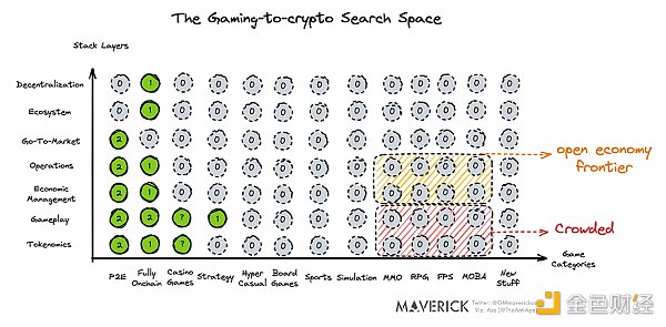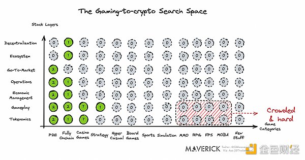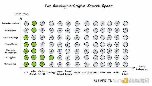 单元格(计数器):每个单元格中的数字表示 crypto 领域已经看到的相对成功的尝试次数。每一款热门游戏——即使最终失败,也会推动 crypto 技术向前发展,让我们离终极解决方案更近一步。截至今天,最著名的迭代发生在 P2 E(Axie Infinity 和 StepN)、完全链上的(黑暗森林和加密猫)、菠菜游戏(几个新老设计都没有赢得多少日活)和策略游戏(黑暗森林 again)。