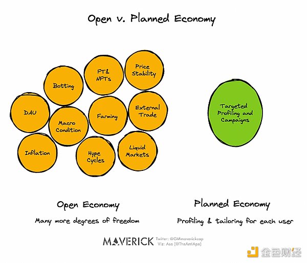 4. 经济管理和中心化:在实体经济中,有中央银行和财政部门以一种相当特别的方式自由调节经济活动。在传统游戏中,一个庞大的运营团队日以继夜地工作以平衡数字。不可能建立一个完美的经济,它将永远完美运行。但自由裁量的中心化经济调控自然与 crypto 对所有权和可信中立性的承诺存在紧张关系。在可玩性和所有权可预见性之间取得微妙的平衡将具有挑战性。