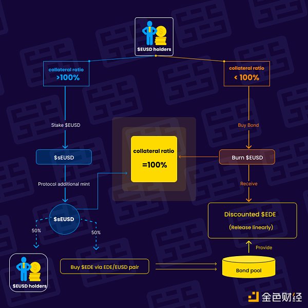 由于 EUSD 需要维持锚定,因此还有在抵押品价值波动时候维持锚定的 Stake & Bond 机制: