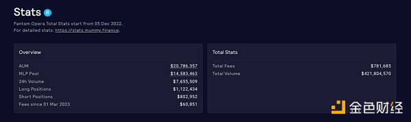 截至目前 (数据均为 3 月 5 日),Mummy finance 的平台交易量已超过 4 亿美金, MLP 已有近 1500 万美金的 TVL,产生了约 78 万美金的费用,数据并不亮眼。