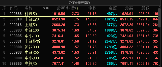 今天早盘,A股飙了!沪指早盘收报3278.01点,涨1.58%,成交额2547亿元。深成指早盘收报11377.83点,涨1.25%,成交额3278亿元。创业板指早盘收报2316.73点,涨0.64%。科创50指数早盘收报1019.56点,涨2.73%。北上资金狂买超120亿元。究竟发生了什么?