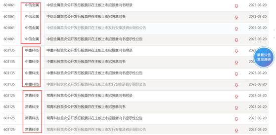 3家均为拟在沪市主板上市的企业,从初步询价日来看,最早的是中重科技,为3月22日;中信金属、常青科技均为3月23日。