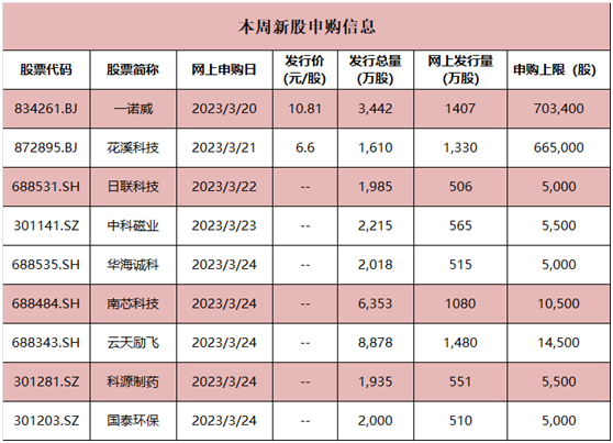 本周(3月20日—3月24日),截至目前,共有9只新股将进行申购,其中创业板3只(中科磁业、科源制药、国泰环保),科创板4只(日联科技、华海诚科、南芯科技、云天励飞),北交所2只(一诺威、花溪科技)。值得注意的是,本周的新股主要在创业板和科创板。