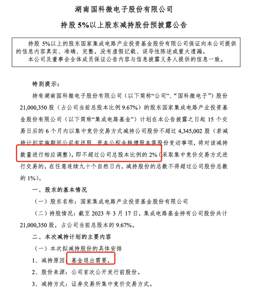 3月17日晚间,再次有半导体公司国科微公告称,持股达9.67%的股东大基金拟自该公告披露之日起15个交易日后的6个月内,以集中竞价交易方式减持公司股份不超过434.5万股,即不超过公司总股本比例的2%。此次大基金减持的原因在于基金退出需要。
