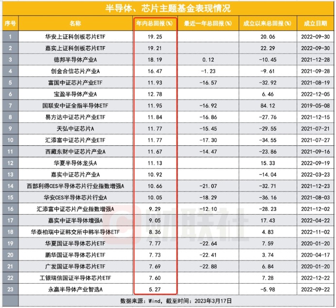 尽管今年投资主线还未浮现,半导体却已经率先走出一波上行。财联社记者统计显示,截至3月17日,市场上23只明确半导体、芯片主题基金表现均为正,业绩最好的是华安上证科创板芯片ETF,年内收益率为19.25%,同期收益率超过10%的还有嘉实、德邦、创金合信等14只基金,在主题基金中占比超过半数。