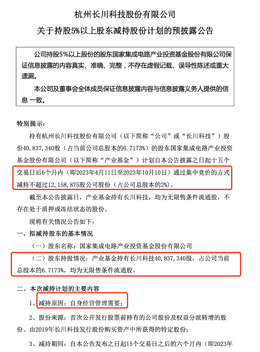 仅隔一天,3月16日,半导体设备公司长川科技也公告称,大基金因自身需要减持公司约2%股份。