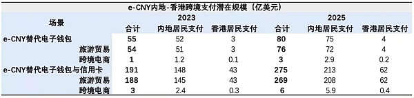 综上,倘若条件成熟时,e-CNY在初始阶段实现对电子钱包的替代,那么两地居民使用e-CNY进行跨境零售支付的潜在规模在2023年可达55亿美元,2025年达80亿美元。假如e-CNY支付的便利性提升,能实现替代信用卡支付,那么2023年跨境零售支付潜在规模可达到191亿美元,2025年可达275亿美元。(下图所示)