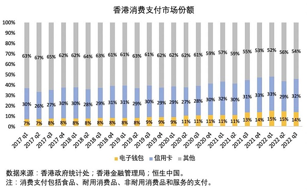 在香港,电子钱包的支付份额在疫情期间上升了5个百分点。2022年第三季度,储值支付工具的份额达14%,支付规模为642亿港元。其中451亿港元为商户消费支付,191亿港元为网上消费支付。假设此支付习惯延续到香港居民在内地的消费,那么电子钱包占信用卡外消费的比例可达20%。