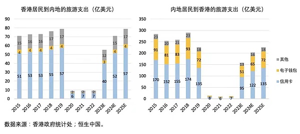 对于内地的电子钱包消费,中国银联的调查显示,2021年,内地一线城市受访人群月消费总额中,移动支付的占比约为八成;四五线城市受访人群月消费总额中,移动支付的占比超过九成。假设此支付习惯延续到内地居民在香港的消费,那么按照移动支付占信用卡外支出的80%计算,电子钱包的支付比例可以达到32%。