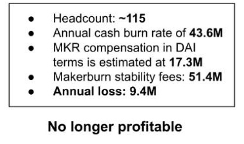 MakerDAO的创始人Rune Christensen指出在熊市中,MakerDAO的借贷收入和清算收入大幅下降,而整个协议需要大约115人的团队来维护,团队支出加上MKR的补偿使得整个协议处在亏损状态且没有增长点。此外,MKR的赋能有限。MKR从21年5月后价格一路阴跌,MKR持有者无法清楚地了解MakerDAO创造的收入具体是如何被耗尽的。