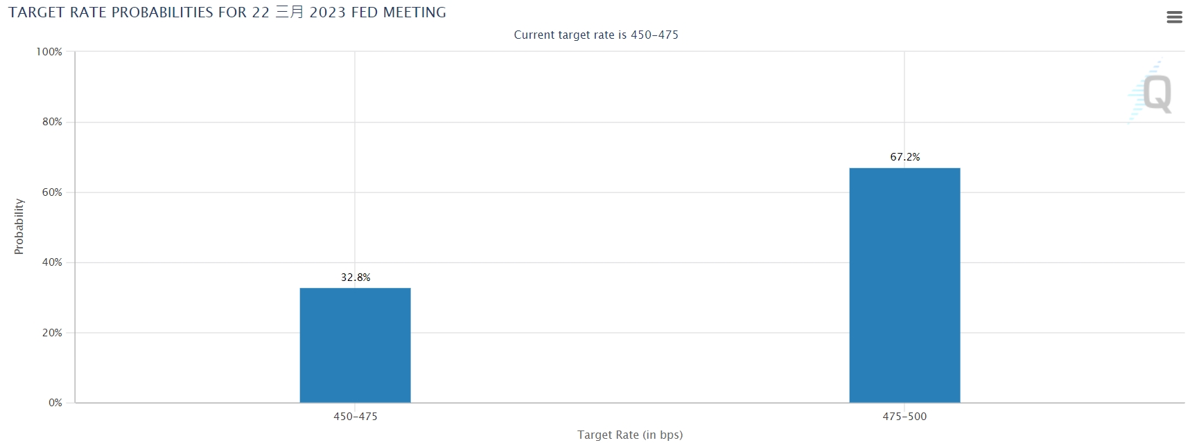 据CME的FedWatch工具显示,市场目前预测,联准会在本月21、22日会议上决议不升息、使联邦资金利率维持在4.5%至4.75%的机率为32.8%,升息1码、使联邦资金利率维持在4.75%至5%的机率则为67.2%。