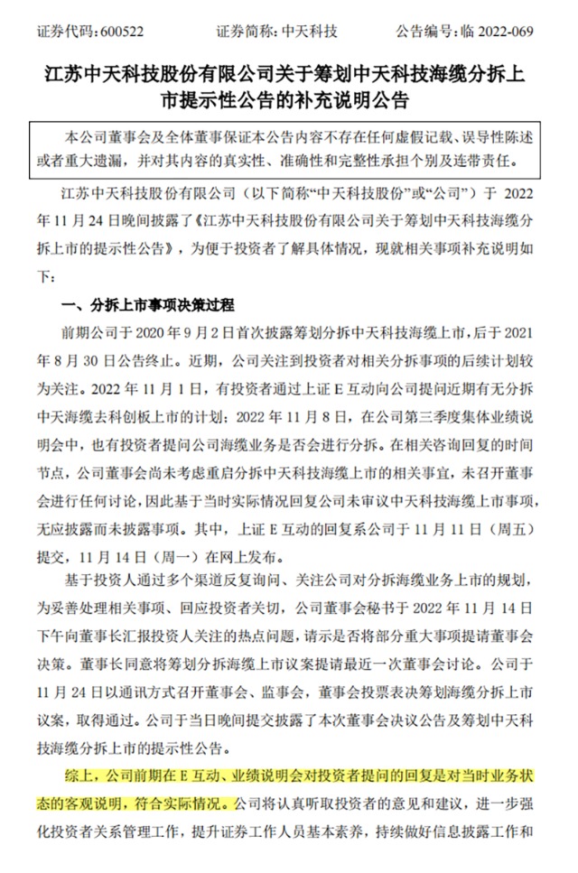 在2022年11月25日发布的“分拆上市补充说明公告”中,中天科技表示,前期,中天科技于2020年9月2日首次披露筹划分拆中天科技海缆上市,后于2021年8月30日公告终止。近期,中天科技关注到投资者对相关分拆事项的后续计划较为关注。2022年11月1日,有投资者通过上证E互动向上市公司提问近期有无分拆中天科技海缆去科创板上市的计划。