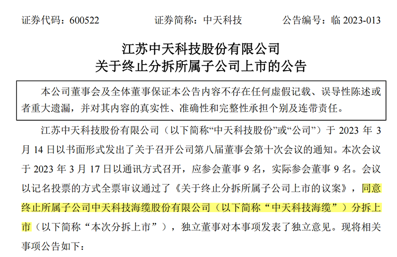最后,中天科技强调,本次终止中天科技海缆分拆上市,对公司及中天科技海缆生产经营活动和财务状况不会造成重大不利影响,亦不会阻碍公司整体战略规划的实施。