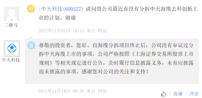 中天科技表示,在相关咨询回复的时间节点,上市公司董事会尚未考虑重启分拆中天科技海缆上市的相关事宜,未召开董事会进行任何讨论,因此基于当时实际情况回复上市公司未审议中天科技海缆上市事项,无应披露而未披露事项。其中,上证E互动的回复系中天科技于2022年11月11日(周五)提交,2022年11月14日(周一)在网上发布。