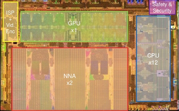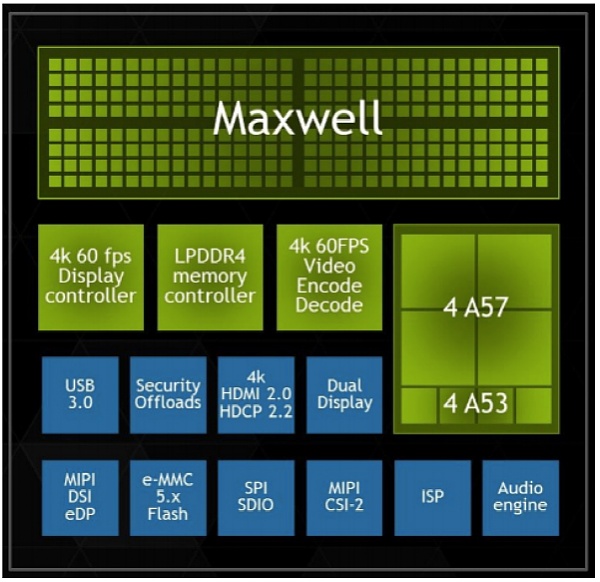 以Tegra X1为例,其采用标准的CPU GPU架构,CPU部分采用4颗Arm A57内核和4颗A53 内核,核心数总计8颗;而GPU部分则采用Maxwell架构,核心数高达256颗。这种“暴力堆砌”下,单颗Tegra X1的算力居然攀到了1 TFlops。