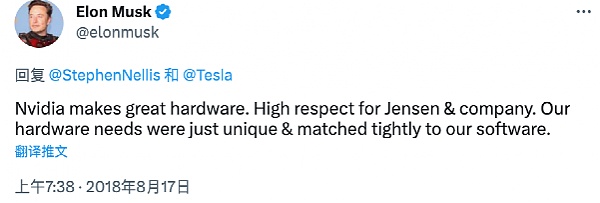 电话会议结束后,马斯克立即在twitter上回应,措辞的塑料友谊感十足:“Nvidia制造了很棒的硬件,高度尊重黄总的公司。”同时又很司马昭地表示:“我们的硬件需求是很独特的,需要跟我们的软件紧密匹配。”