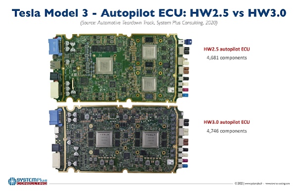 首先亮相的其实是硬件。2019年4月,特斯拉终于发布了“自主可控”的自动驾驶硬件平台HW 3.0。全球科技圈对此期盼已久:老车主们重点关注能否免费升级,友商们纷纷掏出放大镜准备认真“学习”,而对冲基金和类似System Plus这样的咨询公司则迅速行动,在第一时间对HW 3.0进行了拆解。