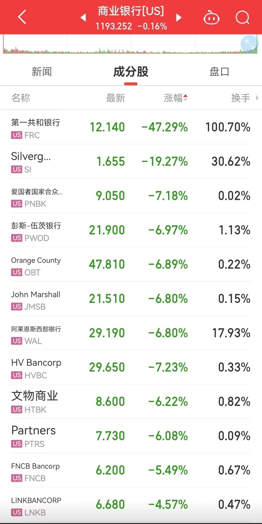 截至当地时间3月20日收盘,第一共和银行(FRC)报12.14美元,跌幅47.29%,市值22.61亿美元。