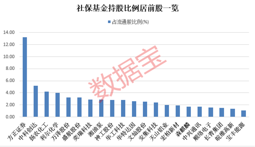 从持股比例看,社保基金持有比例最多的是方正证券,持股量占流通股比例为13.24%;其次是中科创达,社保基金持股比例为5.18%;持股比例居前的还有扬农化工、利尔化学、万泽股份等。