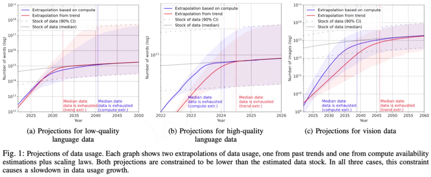 有研究预计,互联网上可用的数据资源很有可能会被耗尽,其中高质量的语言数据大约在2026年耗尽,低质量语言数据大约在2050年耗尽,视觉图像数据也将在2060年耗尽。