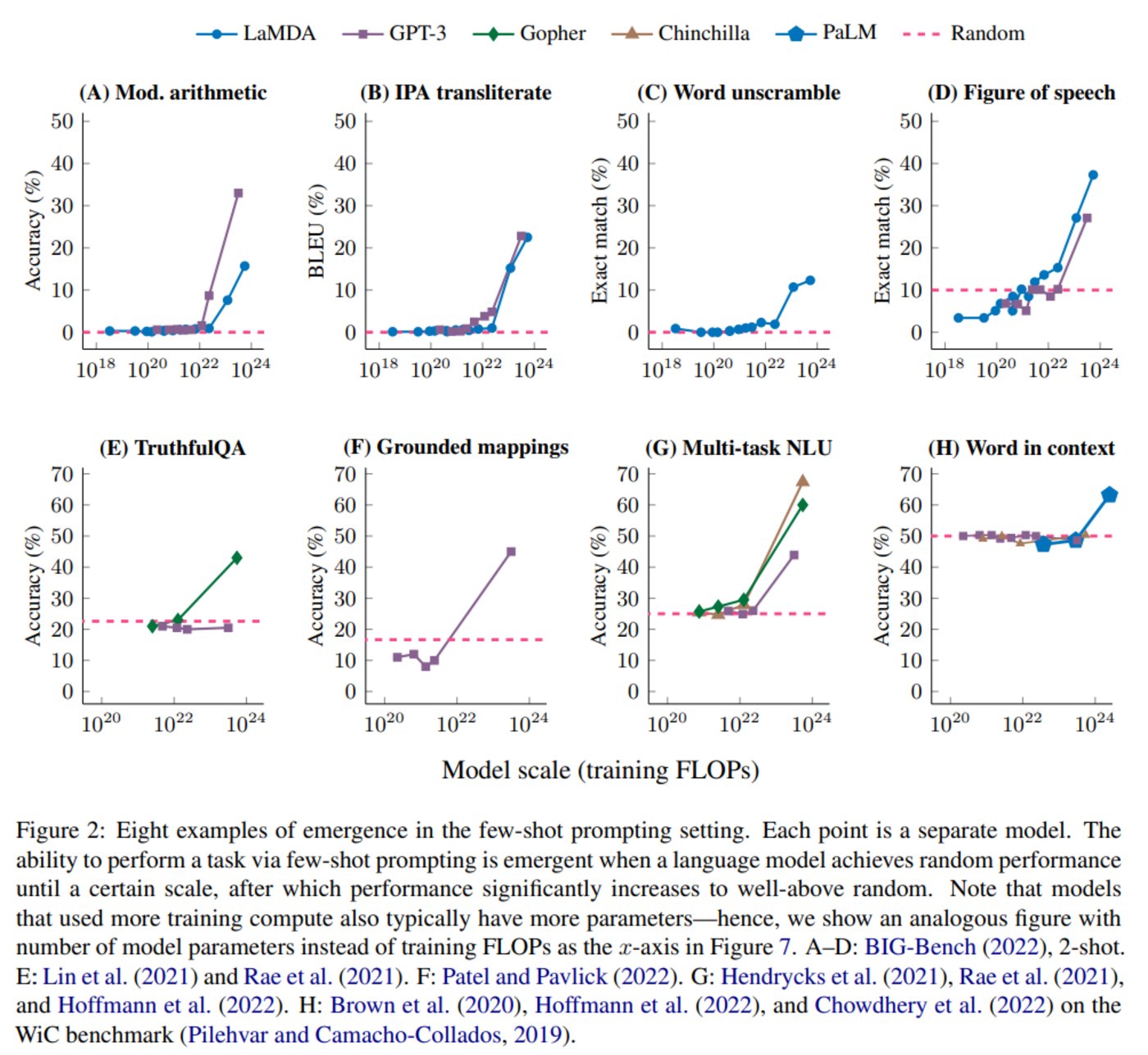 目前这一能力通常在百亿、千亿级别的参数区间出现。“但具体多少参数能够出现涌现现象,也与具体任务、具体模型有关,某些任务13B规模即可,有些任务需要540B,大部分要达到70B。”新浪新技术研发负责人张俊林提到。