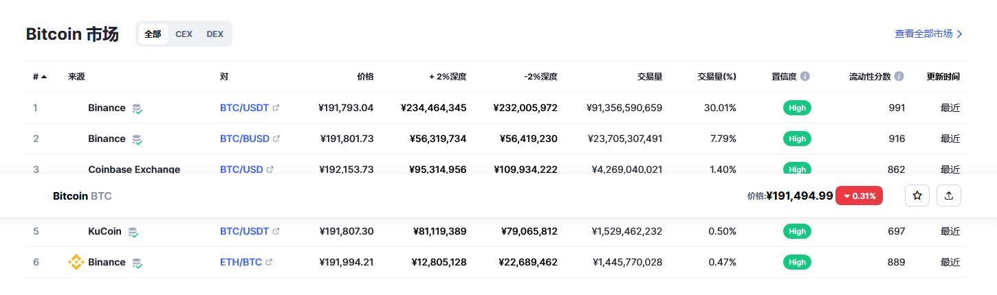 导读Bitcoin 今日价格 为 ¥191,837 CNY,其 24 小时的交易量为 ¥304,380,966,144 CNY。 我们会实时更新BTC兑换为CNY的价格。 Bitcoin 在过去 24 小时内下跌了 0.09。 目前的 世链财经 排名为第 #1 位
