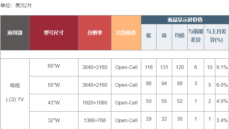 具体来看,尺寸越大,涨幅越大。其中65吋电视面板与前期相比上涨6美元,与前月相比则上涨10美元、涨价9.1%,为本月涨价幅度最大的面板产品。