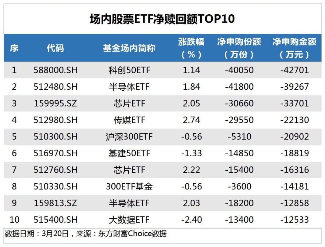 数据还显示,昨日净赎回金额最多的场内股票ETF为科创50ETF,赎回金额4.27亿元,半导体ETF紧随其后,赎回金额3.93亿元。