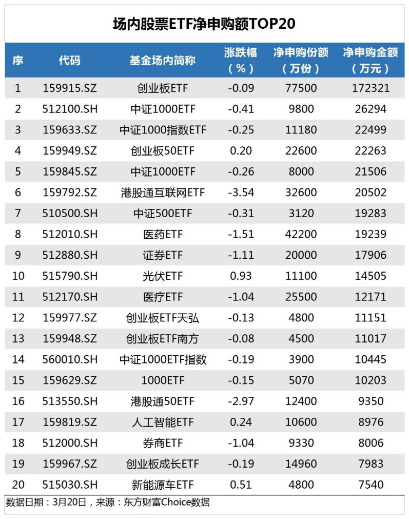 昨日(3月20日),两市成交额10575亿,较上个交易日放量844亿。理财笔记Choice数据显示,昨日场内股票型ETF净申购16.42亿份,其中,沪市股票型ETF净赎回0.64亿份,深市股票型ETF净申购17.06亿份。以最新净值计,昨日市场净申购25.89亿元。