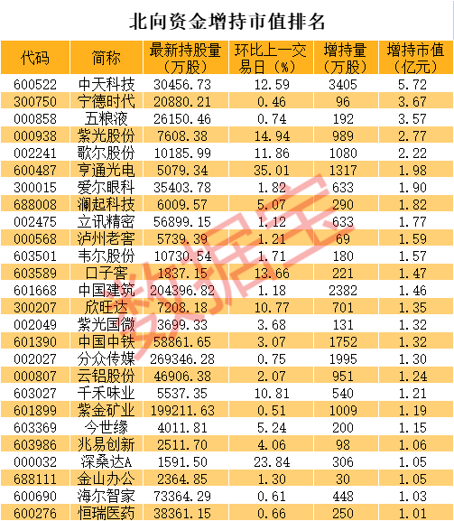 增持市值最多的是中天科技,北上资金最新持股量为3.05亿股,环比上一个交易日增加12.59%,增持市值为5.72亿元;其次是宁德时代、五粮液,增持市值分别为3.67亿元、3.57亿元。