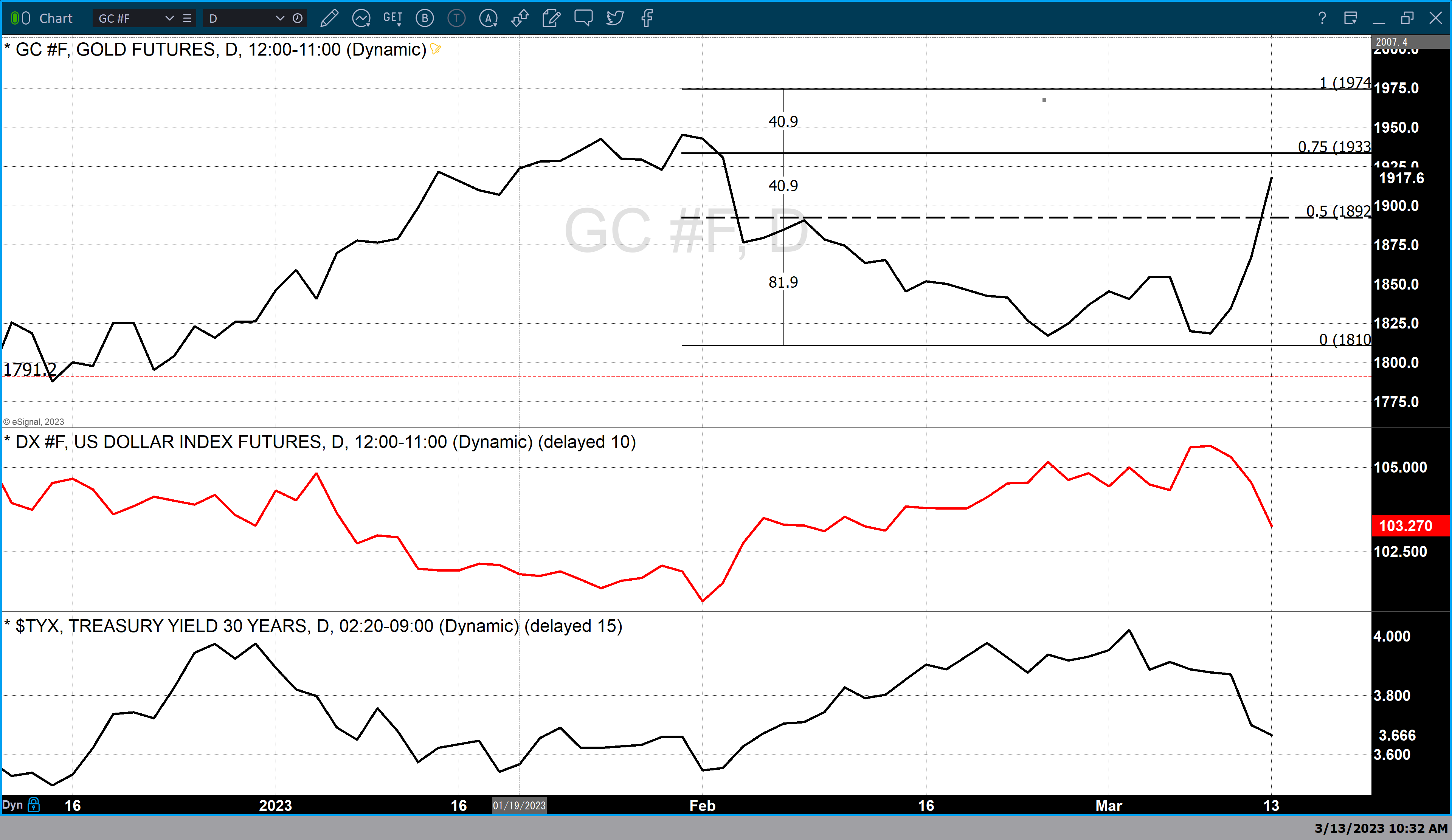 黄金的大幅上涨主要是潜在的银行危机的副产物,据银行监管机构称,有两家银行显示出 "系统性风险"。加州的硅谷银行和纽约的签名(Signature)银行在周末需要立即采取行动,以保护储户的资本。银行业的崩溃导致两年期国债收益率出现了自1987年黑色星期一以来最大的三天跌幅。