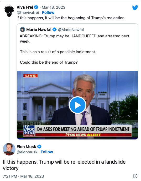 埃隆·马斯克是在回应一则新闻,该新闻详细介绍了曼哈顿地方检察官即将提出的起诉。地方检察官阿尔文·布拉格即将决定是否就2016年总统大选期间向斯托米·丹尼尔支付的封口费指控特朗普。