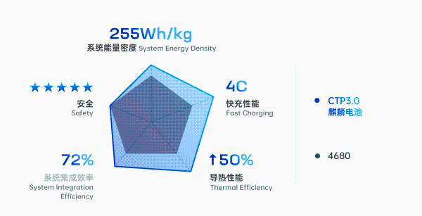据宁德时代当时介绍,麒麟电池的体积利用率突破了72%,配用三元电芯能量密度可达255Wh/kg,磷酸铁锂电池系统能量密度可达160Wh/kg,电池包集成度为全球最高。在相同的化学体系、同等电池包尺寸下,麒麟电池包的电量,相比4680大圆柱型电池系统可以提升13%。