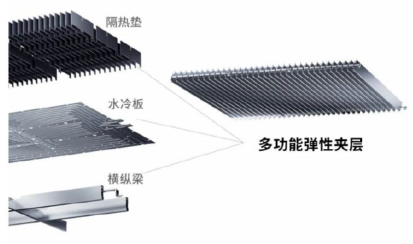 而麒麟电池完全取消模组形态布局,开创性地将横纵梁、水冷板与隔热垫合三为一,集成为多功能弹性夹层,将电芯组成一体化能量单元,不仅具备支撑、水冷、隔热、缓冲四大功能,也极大地提升了电池系统集成效率。多功能弹性夹层设计也可在电芯膨胀时起到一定缓冲作用,相比电芯贴电芯的设计,电池循环寿命延长。
