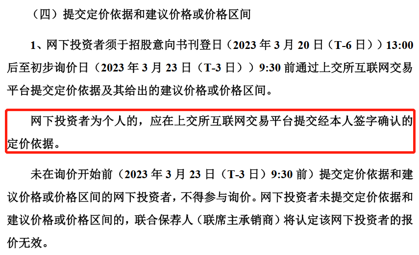 主板注册制企业中信金属在询价公告中表示:“网下投资者为个人的,应在上交所互联网交易平台提交经本人签字确认的定价依据。未在询价开始前提交定价依据和建议价格或价格区间的网下投资者,不得参与询价。网下投资者未提交定价依据和建议价格或价格区间的,联合保荐人(联席主承销商)将认定该网下投资者的报价无效。”