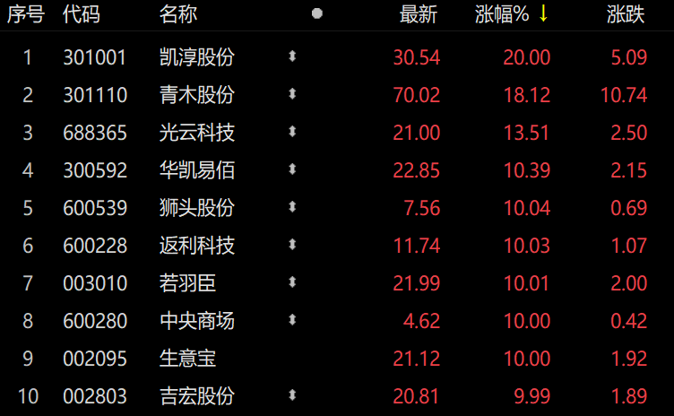 截至今日收盘,凯淳股份20CM涨停,青木股份涨18.12%,光云科技、华凯易佰涨超10%,狮头股份、返利科技、若羽臣、**商场、生意宝、吉宏股份涨停。