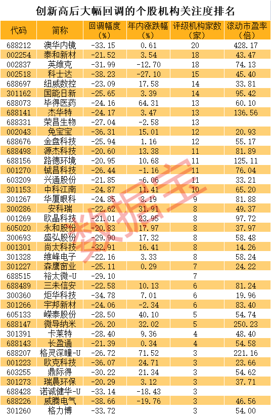 证券时报·数据宝统计,3家以上机构评级的个股中,有39股股价今年创出历史新高,但最新价较历史高点回调超20%。