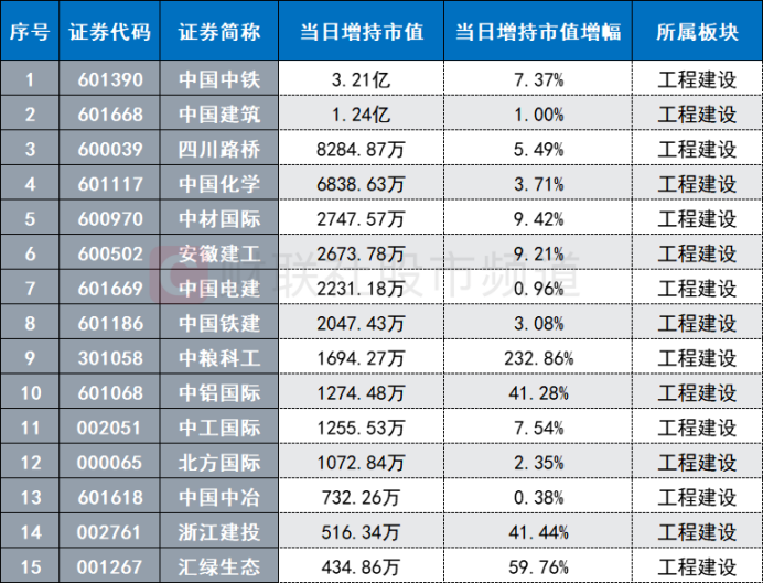 注:北向资金3月21日增持居前的建筑股