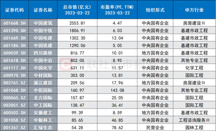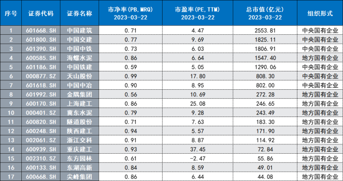 注:市净率低于1的国企建筑股(截至3月22日收盘)