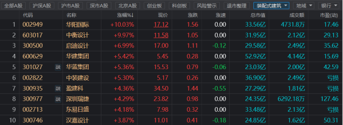 今日(3月22日),建筑板块大幅走高,多只个股表现活跃。截至收盘,华阳国际、中衡设计双双封板涨停,启迪设计涨近7%,华建集团、华蓝集团、中装建设、盈建科、深圳瑞捷、东易日盛等多股涨幅居前。