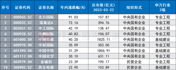 注:年内涨幅居前的建筑股(截至3月22日收盘)