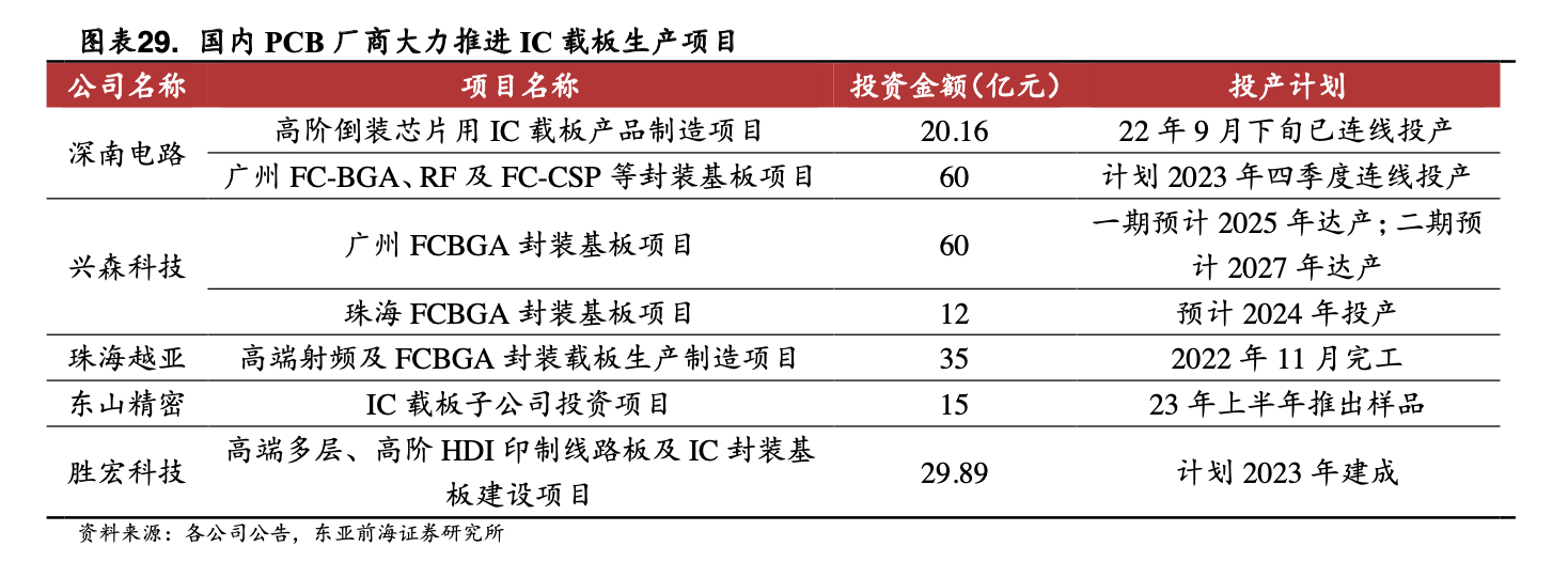东亚前海证券李子卓认为,深南电路、兴森科技、珠海越亚、东山精密、胜宏科技等国内PCB厂商加大IC载板项目投建力度,有望成为该领域直接成像设备的国产化通道。未来若能凭借自身优势切入国内IC载板投建项目供应链,预计国产化率将获得可观提升。