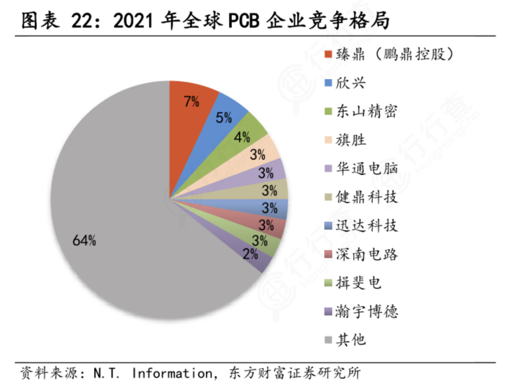 Prismark统计数据显示,目前全球PCB市场规模稳定增长,行业集中度较低。2021年全球PCB企业CR10仅为36%,行业集中度较低,市占率第一的臻鼎(鹏鼎控股)其市场份额为7%。
