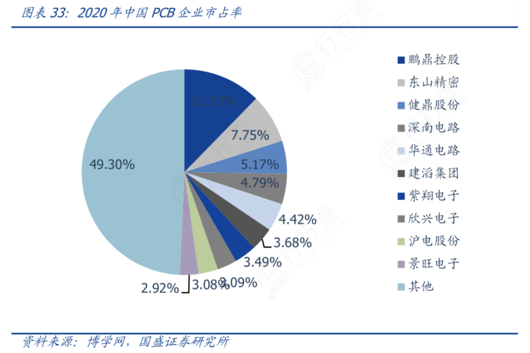 我国作为全球PCB中心,产值全球占比超50%。国盛证券研报中数据显示,据2020年营收看,臻鼎营收规模远远领先其他厂商,欣兴电子、东山精密营收规模相近,深南电路、华通电路、建滔集团、紫翔电子、沪电股份、景旺电子亦位列国内排名前十的PCB厂商名单。