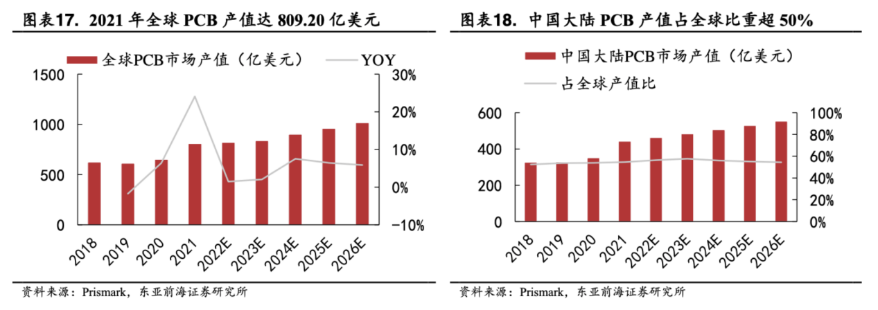 据东亚前海证券3月22日研报显示,长期来看PCB市场中通信板块需求有望维稳,数据中心、汽车领域需求依然高涨。预计2023-2026年PCB市场年均复合增长为4.8%,到2026年全球PCB市场产值将达到1015亿美元。