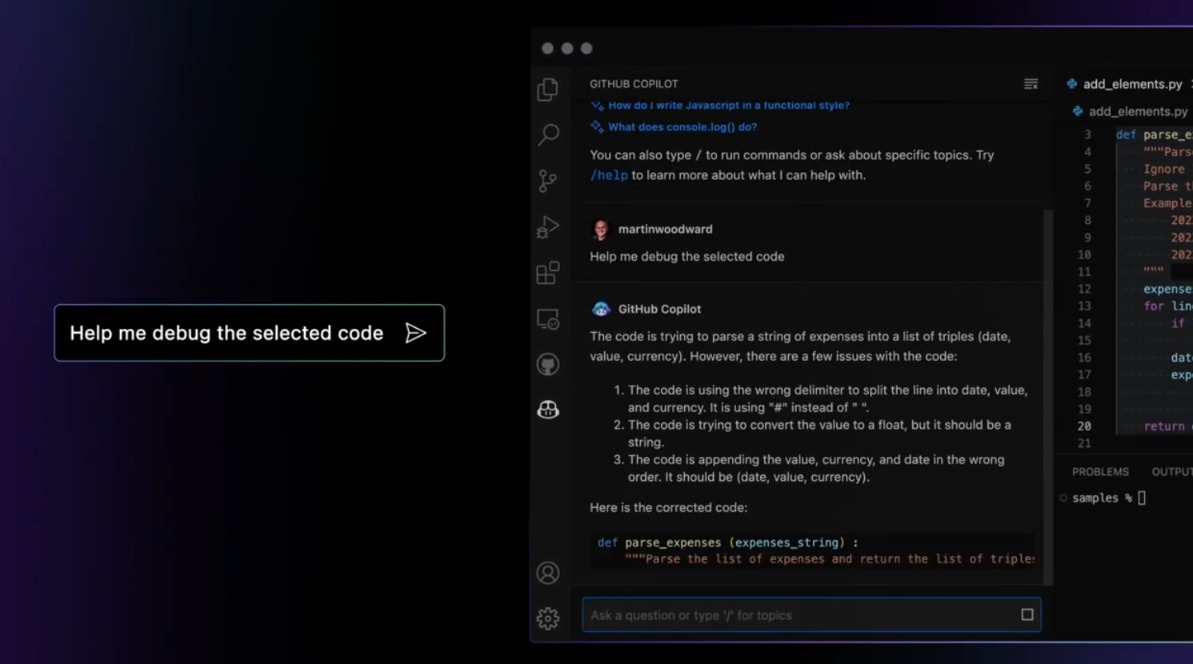 其中最主要的升级,是基于GPT-4的对话功能。开发者可以通过与机器人进行对话完成诸多日常工作,而且这里的对话并不限于在聊天框中打字,Copilot X同样支持语音输入,意味着开发者可以直接向AI说出自己的命令。