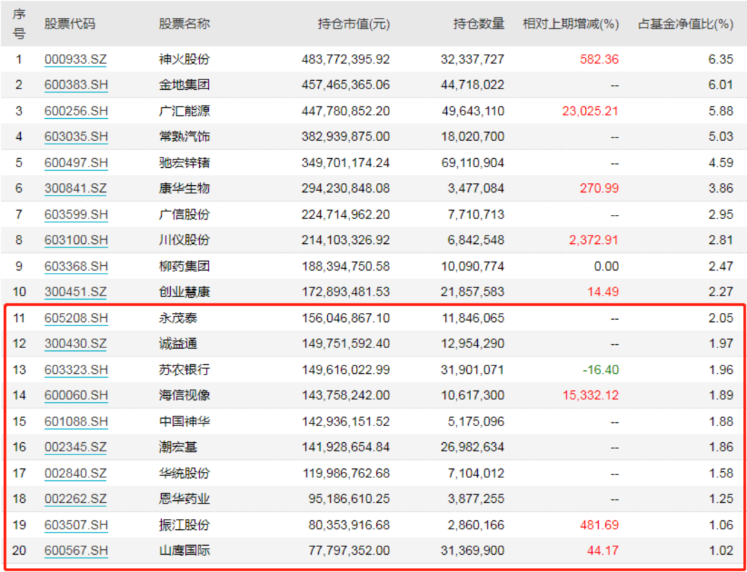 中庚小盘价值第11位至第20位重仓股主要有永茂泰、诚益通、苏农银行、海信视像、中国神华、潮宏基、华统股份、恩华药业、振江股份、山鹰国际。其中,永茂泰、诚益通、中国神华、潮宏基、华统股份、恩华药业等多股为新进持仓股票,海信视像、振江股份等获大幅加仓。